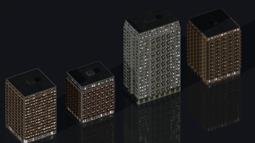 All buildings are medium poly with a good amount of facade detail. The interiors are made up of a cube with with image mappings to keep the buildings lightweight. There are multiple types of materials that are random, including blinds. The buildings are suitable for Eeevee and Cycles and for both day and night shots.