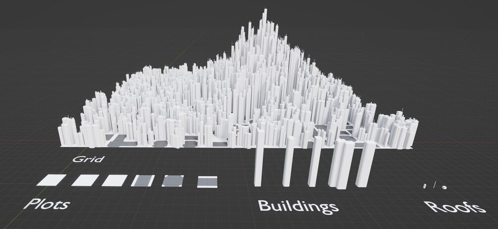 This is a simple city grid setup that shows how to work with generative cities. Useful as backdrops for scenes and for learning how to work with geometry nodes.