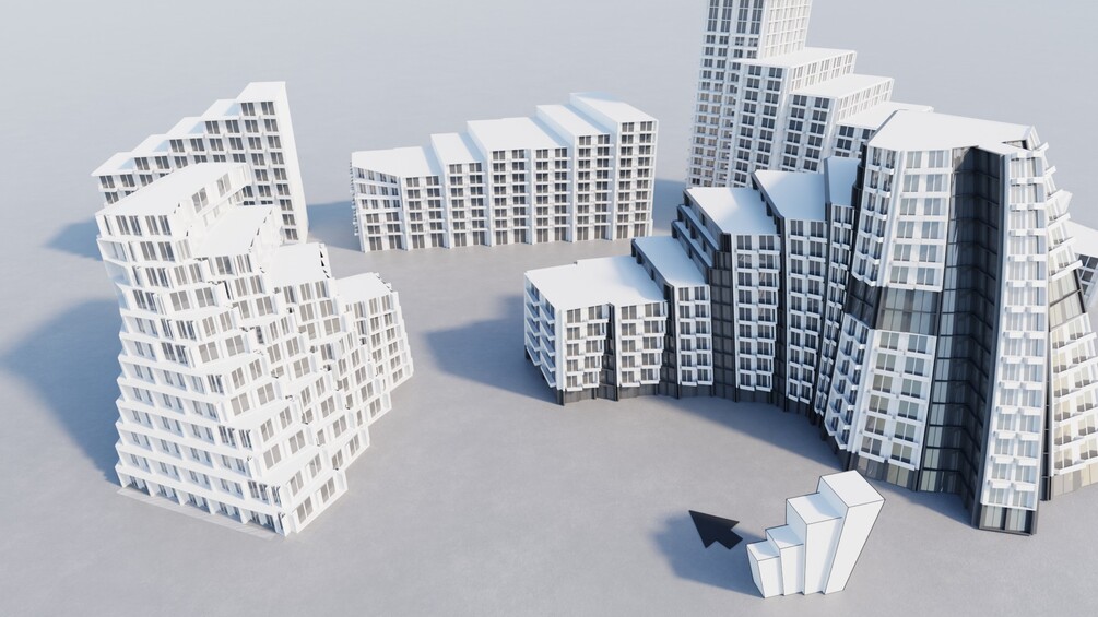Thus, second, we will investigate procedural techniques of generating architectural concepts from the earlier sets of massings. The intent is to provide you with highly creative workflows by reducing the manual process of editing the massings to a minimum. In this step-by-step process, the techniques become more advanced where, eventually you will learn how to further streamline the process with Geometry Nodes into an almost completely automated massing and architectural concept generation process.